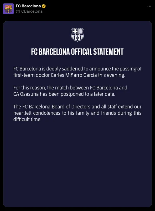 Shortly after the announcement, Barcelona released a statement expressing its deep sadness over the passing of first-team doctor Carles Miñarro Garcia, who was 40 years old. Miñarro had been with the club since 2017, initially working with Barcelona’s futsal team before joining the first-team staff this season.