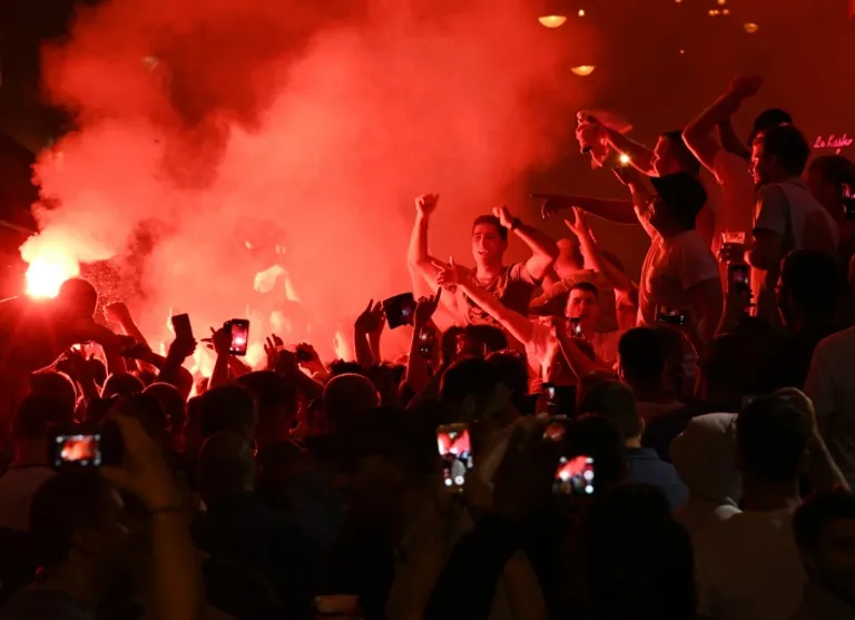 The night ended with hundreds of boozed-up and bare-chested fans standing, beer glasses in hand, staring down French CRS riot police on the other side of the street.