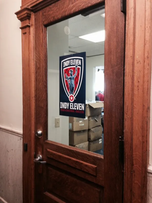 The Indy Eleven office is inconspicuous. A small sign hangs by the front door of a large building, all but lost among the bustle of the city around it. You’d easily miss it if you weren’t looking for it. Inside, though, things are different. Each member of the staff wears the red and blue of their club. Most elect to wear a pullover or a t-shirt with the Indy Eleven logo, some wear suits with a pin depicting the crest. If the outside is inconspicuous, the inside is anything but.