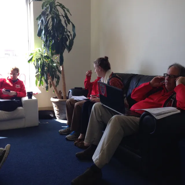 Directly after this meeting is another. The previous meeting was subdued, efficient, and logistical, but this one is bustling. It takes place in the same small corner room, but nearly everyone is involved. The room is literally overflowing with people. Among them is Juergen Sommer, Indy Eleven’s head coach, who sits on one of the windowsills because all the seats at the table are taken. Others sit on the floor, some just outside the meeting room door. There isn’t enough room to come close to accommodating everyone, but they make do.