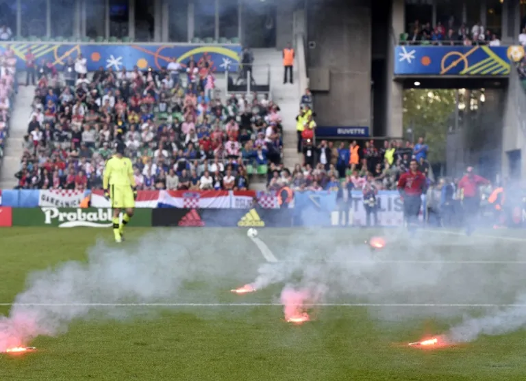 With Croatia 2-1 up, referee Mark Clattenberg briefly halted play when flares thrown from the Croatian fan block landed on the Saint-Etienne pitch, minutes before the 90 minutes were up.