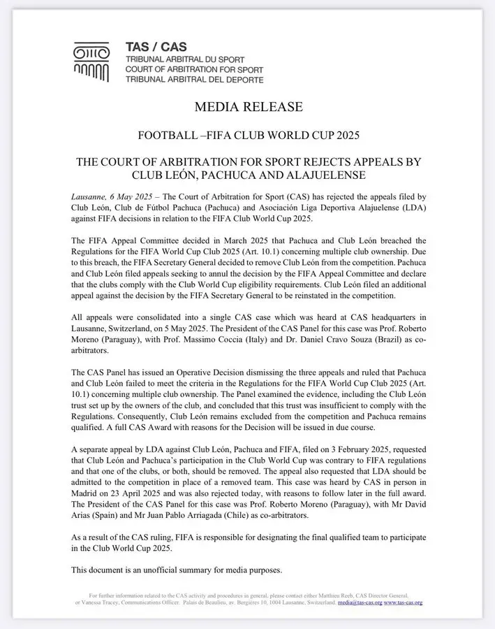 After the Mexican team appealed to CAS to argue its reasons for participating in the 2025 Club World Cup, this Tuesday – just over five weeks before the start of the tournament – the Court ruled, confirming that León will not be part of the contest.