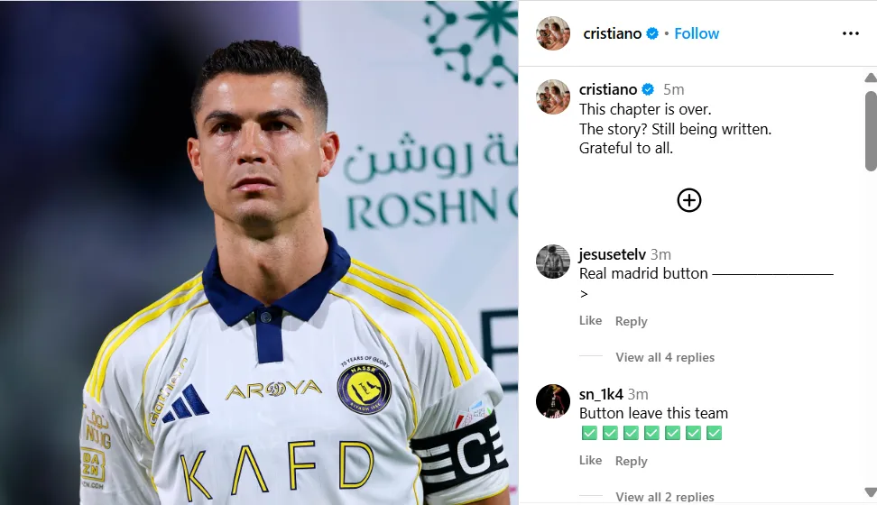 While the post sparked speculation, the five-time Ballon d’Or winner followed it with a reassuring message that seemed to rule out retirement. “The story? Still being written. Grateful to all,” Ronaldo ended his message.
