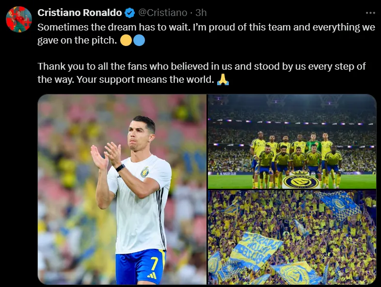 With the 24-25 season reaching its conclusion, the defeat against Kawasaki ends up being a huge blow for Al Nassr’s silverware aspirations. As the loss sank in, Ronaldo addressed supporters through a message on his social media: