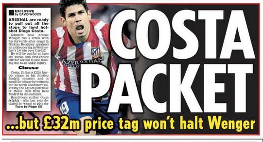 Considering that the January transfer window is open, it’s always difficult to ascertain whether the transfer gossip printed in the media, especially British tabloids, is true or not. There’s no doubt that Arsenal are in need of a striker given the fact that Olivier Giroud, Nicklas Bendtner and Yaya Sanogo are all out injured. Whether Wenger will consider a huge splash in the transfer market to try to sign Costa, we’ll have to wait to see.