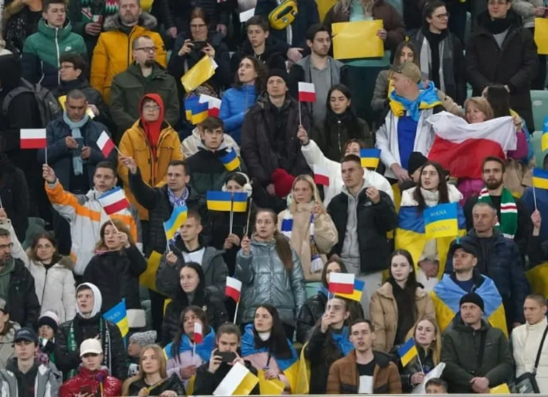 The game was attended by a crowd upwards of 20,000, with a huge “Stop the War” banner displayed across one end of the ground. Other signs read “Stop Russia Now”.