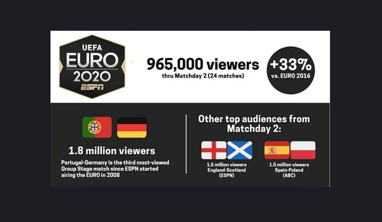 Through Saturday, June 19, Euro 2020 on ESPN and ABC delivered an average audience of 965,000 viewers, a 33 percent increase compared to 723,000 viewers for the same number of matches of Euro 2016.