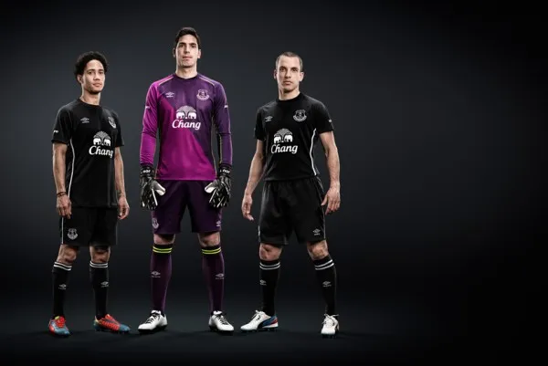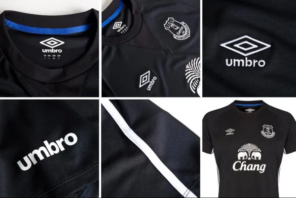 Everton’s black shirt, designed by Umbro, takes its inspiration from Everton’s home shirt that was worn during the 1881-82 season, which was black with a diagonal red stripe across the front. Everton and Umbro decided to omit the red diagonal stripe, and have instead produced a crew neck collar with a v-stretch rib insert for comfort and a knitted shadow stripe that gives the shirt a stylish finish.