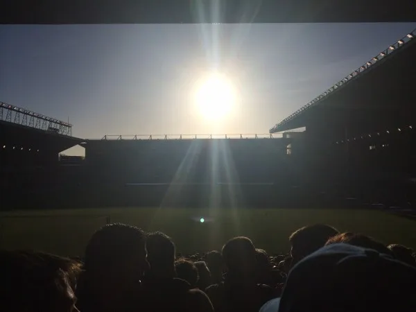 The game kicked off at 1:30pm local time and, as such, those in the Gwladys Street end at Everton’s Goodison Park had to contend with bright sunlight for the opening period. It makes for difficult viewing, especially down the other end of the pitch. A sore right arm too, as those in the Street End have to constantly shield their eyes.