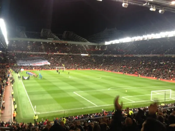 We arrived into Manchester and met a few of my Manchester City-supporting friends for a couple of drinks, who naturally wished us well before the game. For those of you who haven’t been to Old Trafford, the stadium itself is situated about three miles outside Manchester city centre and we jumped onto a crammed Metro train up to the ground. The train station at Old Trafford is literally opposite the visiting supporters section and with about thirty minutes to go until kick-off, we went straight in.