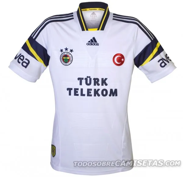 Fenerbahce’s away shirt is a white jersey with black and yellow trim.