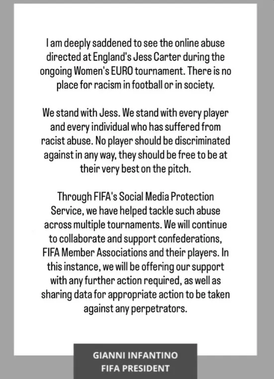 “I am deeply saddened to see the online abuse directed at England’s Jess Carter during the ongoing Wome’s EURO tournament. There is no place for racism in football or in society,” his statement started.
