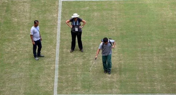 Photographs have been released showing stadium workers spray-painting the pitch green so that the yellow patches of grass across the field are not so noticeable. The pitch also is very bare, sandy and dry. This showcases how bad a idea it was to put a stadium there (due to the extreme weather conditions impacting the quality of the pitch). Plus after the four matches will be played there, the stadium will most likely never be used again.