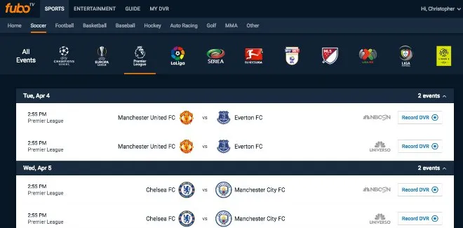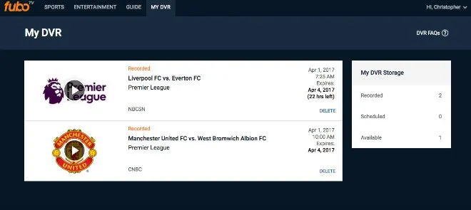 Unlike Sling TV’s Cloud DVR which is priced at $5 per month, fuboTV’s DVR functionality is offered at no extra cost. Plus subscribers have access to three DVR slots. The recordings are available for 72 hours. To record a program, all you have to do is click the blue and white ‘Record DVR’ button. Once the program has completed, you can find the recordings on your ‘My DVR’ page (see screenshot below).