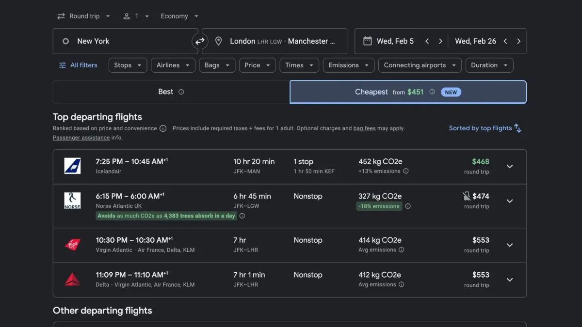 As you look through the deals on Google Flights, remember that it’s not just the airlines you’re familiar with that offer the best deals. For instance, you can usually find great deals with international budget airlines such as TAP Air Portugal (to Portugal), French Bee (to France), Icelandair (to the UK), and Aer Lingus (to England and Ireland). Other than those, my favorite is Norse Atlantic Airways. I flew with them to London in 2023. It’s a no-frills airline (food, heavy suitcases, and seat selection are extra), but they almost always offer great deals. I’ve been able to find deals for as low as $400 (in the winter) to $600 roundtrip (summer) from Florida to London.