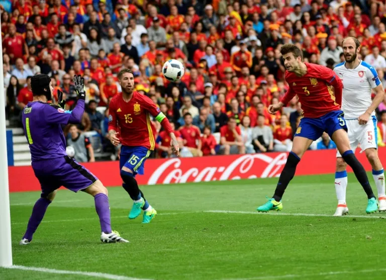 Spain avoided their normal early tournament jitters as Gerard Pique headed home the winner three minutes from time to seal a deserved three points against a dogged Czech Republic with a 1-0 win.