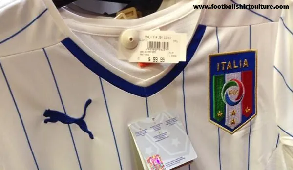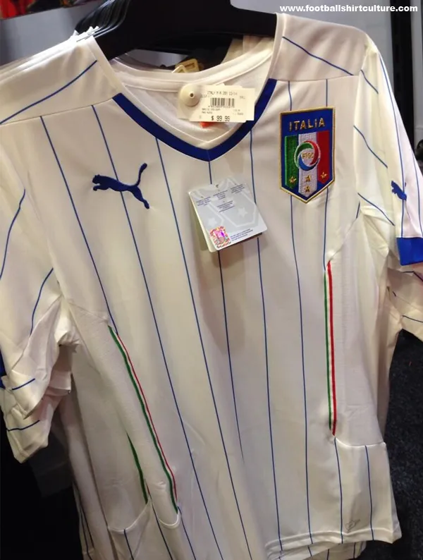 The photos feature the Italy away shirt, designed by Puma, with a white shirt that includes blue pinstripes. The Italy change shirt includes red and green stripes down the side of the shirt, and a blue V-neck collar.