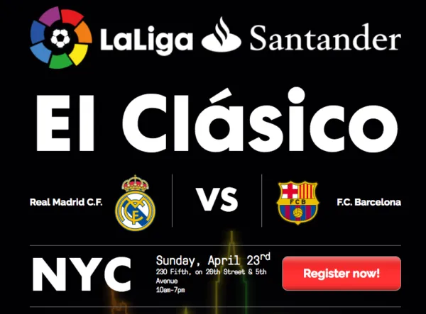 It’s the first time-ever that La Liga has hosted a viewing party for el Clásico in the United States. The event will take place in New York City on Sunday, April 23rd from 10am to 7pm, with a 2:45pm kickoff (local time).
