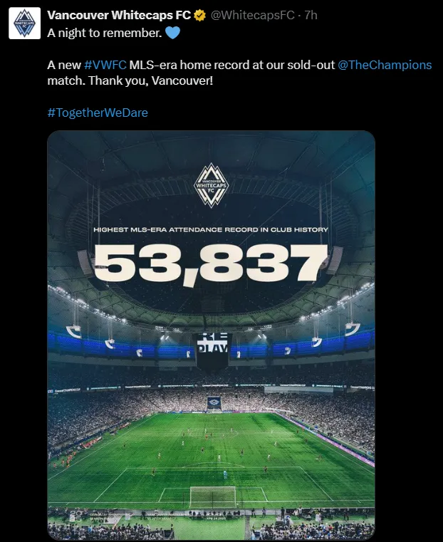 “A night to remember. A new #VWFC MLS-era home record at our sold-out Champions Cup match. Thank you, Vancouver!” posted the Vancouver Whitecaps official account on X.