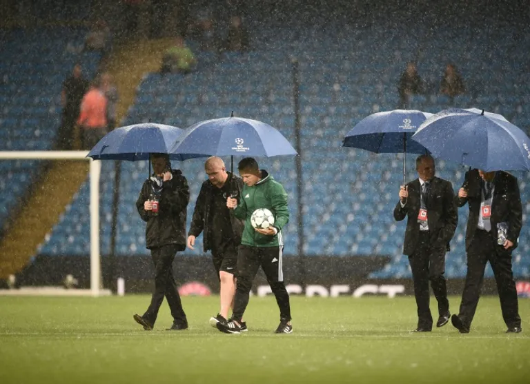 It rained heavily in the city for several hours prior to the scheduled kick-off time and there was thunder and lightning overhead as fans made their way to the stadium.