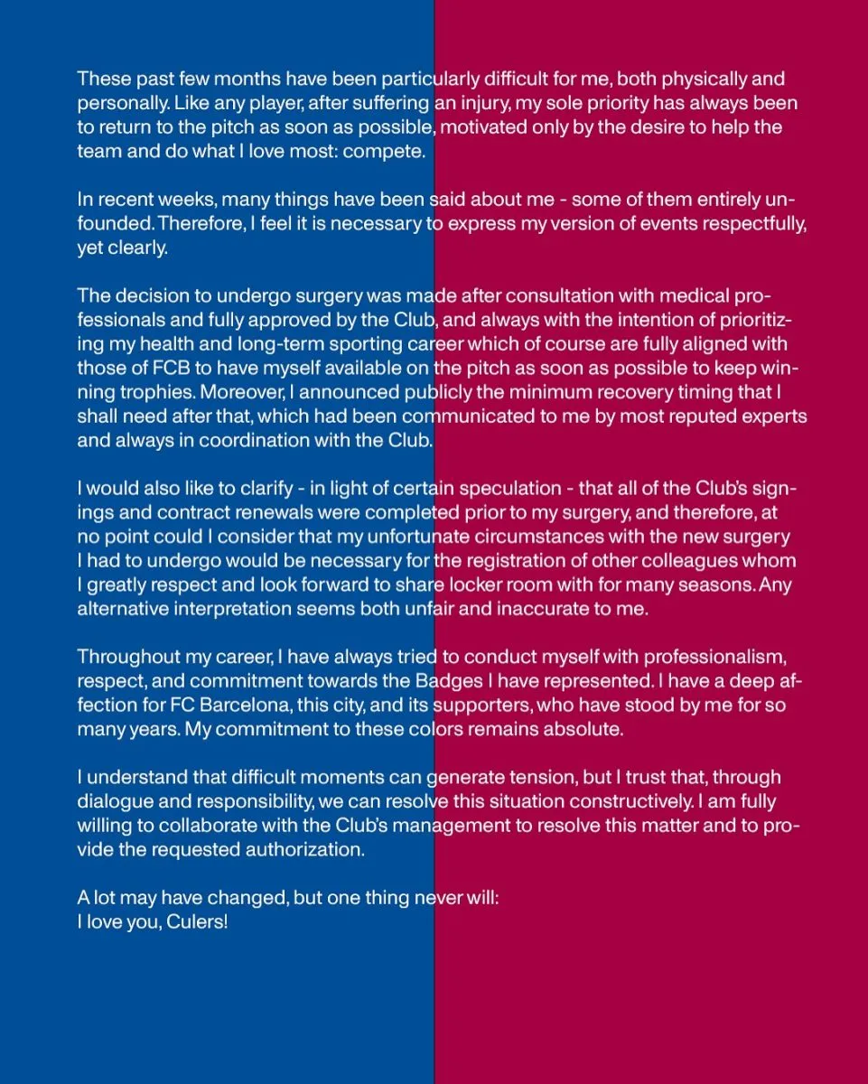 Marc-Andre ter Stegen has found himself at the center of a controversy at FC Barcelona involving his registration status, which led the club to temporarily strip him of his captaincy. Following the incident, the German goalkeeper has broken his silence with an extended, heartfelt statement addressed to the club and fans.