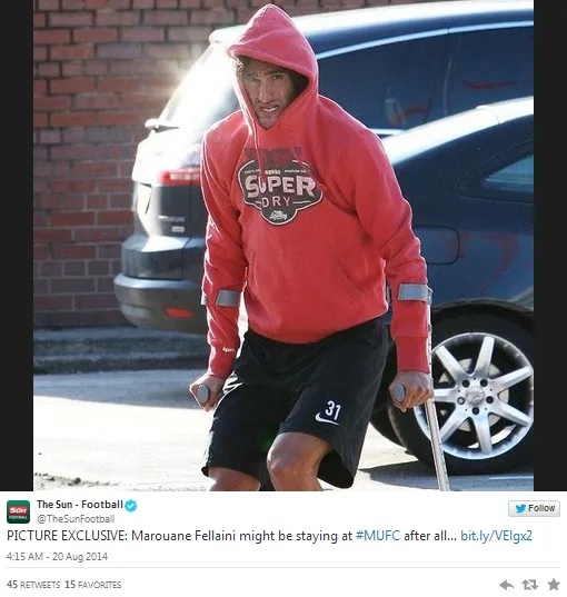 Fellaini was pictured heading to the hospital on crutches with his left foot in a protective boot following yesterday’s practice.