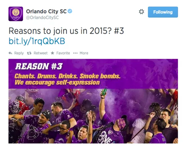 While a smoke bomb canister is considered an explosive and isn’t allowed in a stadium, the Orlando City Soccer Club promotes smoke bombs as a reason to join the club and become a season ticket customer. According to the Orlando City Soccer Club, the club “encourages self expression” and lists smoke bombs as one of the selling points (see below; this was posted before Sunday night’s game).