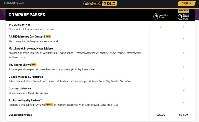 Notably, the price of the flagship Premier League Pass service has increased by 30% from $49.99 per season to $64.99. (Current NBC Sports Gold subscribers have been offered a discount of $59.99/season when their subscriptions auto-renew at the beginning of August).