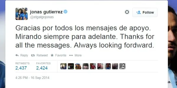 Newcastle United midfielder Jonas Gutierrez has thanked fans via his Twitter account and during an interview on Argentinian television for their support after revealing that he has been undergoing treatment for testicular cancer.
