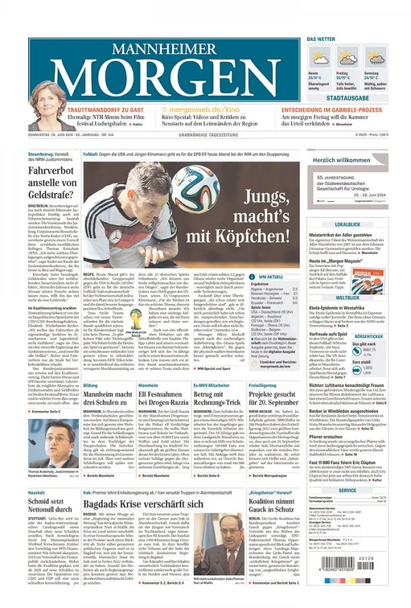 The Mannheimer Morgen has Mirslav Klose threatening his old coach “Jungs” with the little head that helped him equal the record for most World Cup goals.