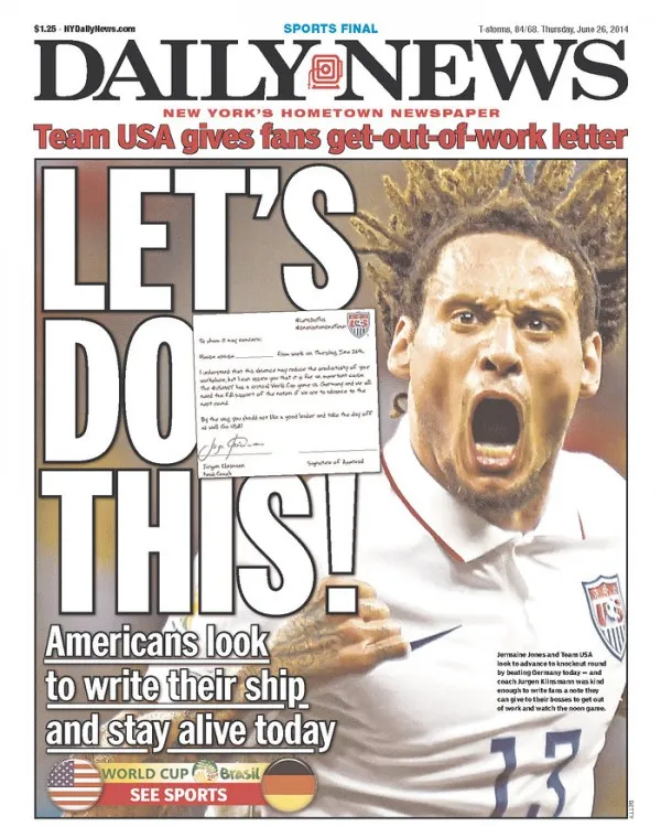 The New York Daily News (above) wins the front page of the day with its inspiring headline backed by a fiery Jermaine Jones. Look into his eyes and see George Washington’s tactical genius, Huck Finn’s adventurous spirit, Horatio Alger’s can-do attitude, Teddy Roosevelt’s drive, Babe Ruth’s power, Chuck Yeager’s courage, Mohammed Ali’s confidence, Mike Tyson’s fury, and Michael Jordan’s swagger.