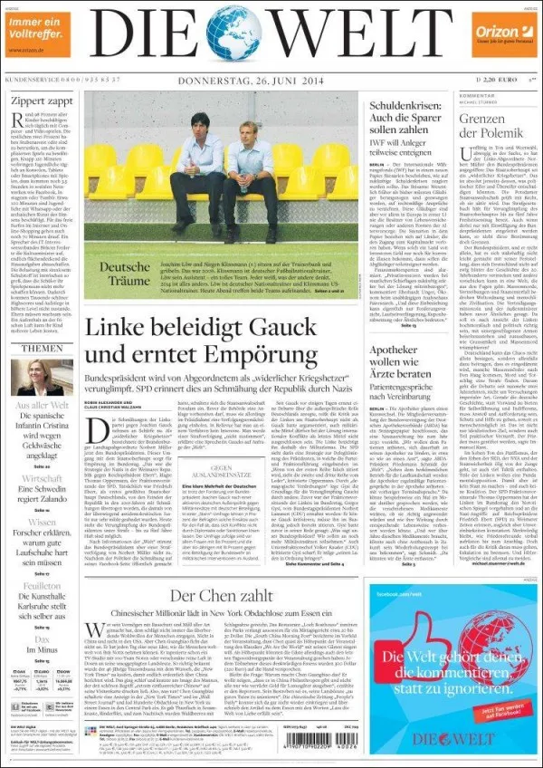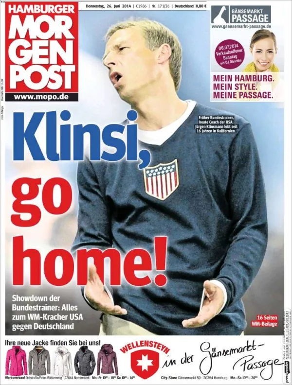 German-Americans are the largest ancestry group in the United States, which makes Jurgen Klinsmann a natural leader for the USMNT. But back in his homeland he’s a traitor and a national obsession. Their papers today ignore the teams themselves to focus on the man won the World Cup for them in 1990 as a player and almost brought it back as a manager in 2006.