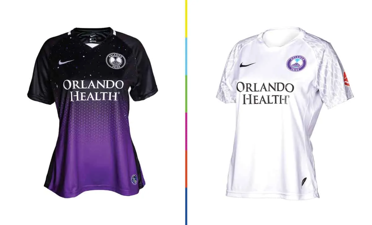 Home: The primary, “Ad Astra” (that’s “To The Stars” in Latin), is black on top transitioning down to Orlando purple at the bottom using a geometric pattern (the pattern reminds me a bit of the solar panels on satellites or the International Space Station). The top is filled with a star field, celebrating Central Florida’s role in space exploration. The bottom left features a mission patch emblem, using the NASA “Worm” font that’s made a ferocious comeback over the last couple of years. This is an outstanding design, and I hope the Pride continue to mix in a healthy does of black in their future designs to give themselves a unique identity different from their brothers on the men’s side.