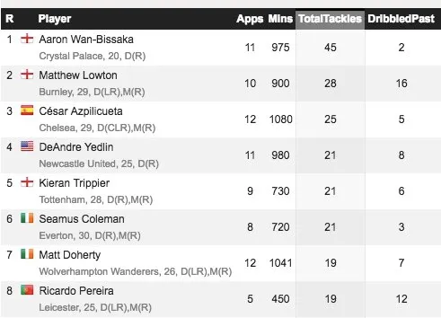 The Palace right back is currently leading all Premier League players at his position in tackles and interceptions, and his tackle-to-dribbled past ratio is an incredible 23 to 1. In addition to his tackling skills, he also ranks very highly in clearances and blocks as well.