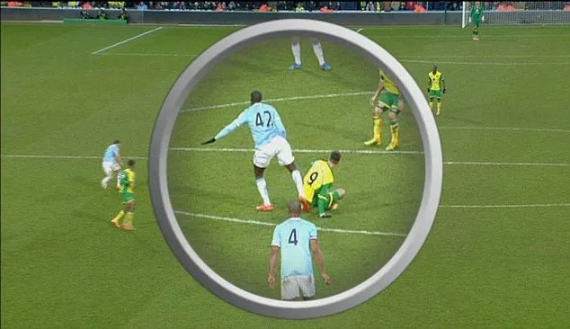 There were two incidents at the weekend that happened off the ball. The first is shown below, where Yaya Toure seemed to kick out at Ricky van Wolfswinkel. Referee, Jon Moss did not see it in my view, after looking at replays, so there was a potential case for retrospective action to go against Toure and that could have led to a 3 match ban, only if the referee did not mention it in his match report. However, The FA has ruled today that Toure will escape punishment.