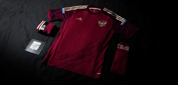 Original features of the shirt include a printed tribute to the Conquerors of Space celebrating Russia’s great space achievements, three adidas golden stripes and the Flag of Russia. The shirts and shorts bear a distinctive mark depicting the gold double-headed eagle. These colors symbolize the royal combination of gold on maroon.