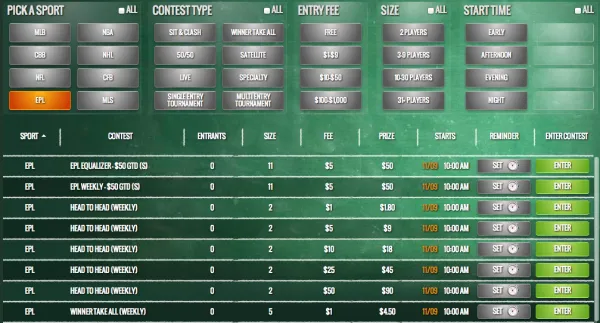 Each contest has a set number of players that you can play against. Depending on the EPL contests I was looking at, there can be as few as 2 or as many as 11 — which are still small numbers and gives you a good chance of winning since the number of opponents are capped.
