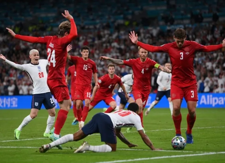 The Manchester City forward went to ground following a challenge by Joakim Maehle after bursting into the Denmark area in the first half of extra time.