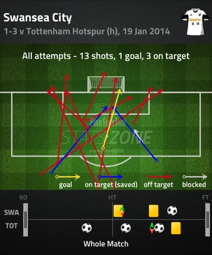 2. The team’s chemistry has been disrupted. Earlier this season, I criticized Laudrup’s decision to select Jonjo Shelvey as one of the first names on the team sheet for Premier League matches instead of the other midfield choices available. As the season has progressed, Laudrup has continued to stick with Shelvey, and the English midfielder has taken on a more prominent role in the side with Michu being out injured. As a result, Shelvey has moved up the pitch more, so instead of just creating chances with long balls over the top or passes that split a defense open, he’s been finding himself in positions where he’s had far more opportunities to score. Sadly, as we saw while he was at Liverpool, his shooting accuracy is — on the whole — woeful.
