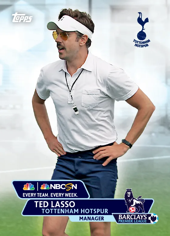 NBC Sports has teamed up with Topps to create several custom trading cards featuring Ted Lasso, Rebecca Lowe, Arlo White, Robbie Earle, Kyle Martino and Robbie Mustoe.