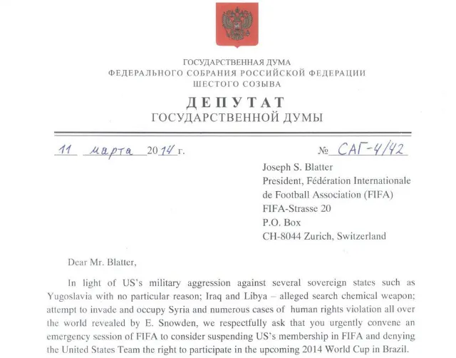 Alexander Sidyakin and Michael Markelov, two members of the Duma, addressed their concern to FIFA about the United States and asked that FIFA would “urgently convene an emergency session to consider suspending the United States FIFA membership and denying the USMNT the right to participate in the 2014 FIFA World Cup in Brazil.”