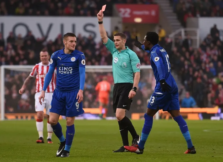 Vardy was dismissed, for the third time in his career, on 28 minutes after launching himself into a challenge on Mame Biram Diouf with his studs showing.