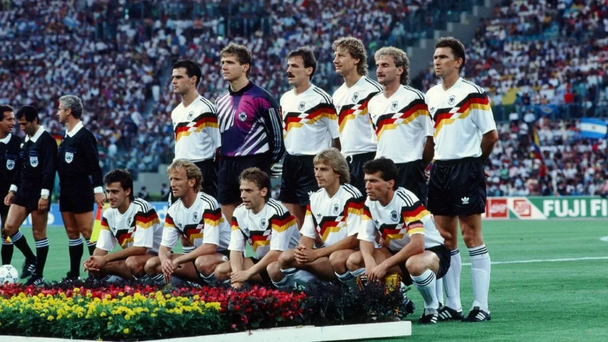 This kit started a trend for Die Mannschaft. The cross-chest sash of black, red, and yellow, the colors of the German flag, looked phenomenal on an otherwise white shirt. Adidas even laid out the stripes in a way that is symbolic of Germany’s timeline. Therefore, the kit tells a story. Two years later, West Germany won the World Cup in Italy before reunification not long after.