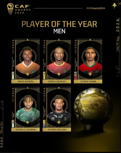 The nominees for the coveted African Player of the Year award are: Simon Adingra (Côte d’Ivoire/Brighton), Serhou Guirassy (Guinea/Borussia Dortmund), Achraf Hakimi (Morocco/Paris Saint-Germain), Ademola Lookman (Nigeria/Atalanta), and Ronwen Williams (South Africa/Mamelodi Sundowns).