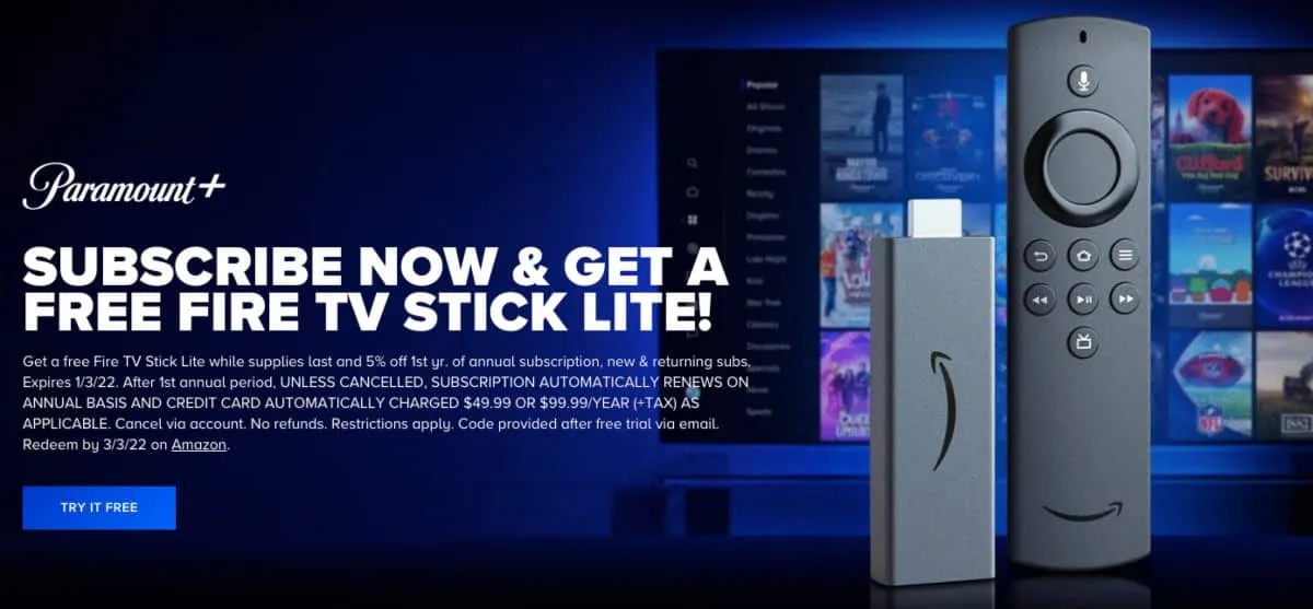 Paramount+ is offering a free Amazon Fire TV Stick Lite and a 5% discount to new and returning subscribers. To get it, sign up for the Paramount+ annual plan. You will then receive an email from Paramount+ after your trial period is over with instructions. Note that the offer expires on January 3, 2022.