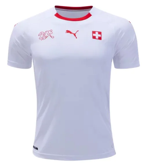 The away jersey is white with accent color red on the collar and logos. Faint sublimated stripes made up of microdots are on the front panel. Embroidered team and PUMA logos. “Suisse” is printed on the upper back.