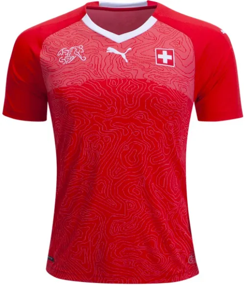 Switzerland’s jersey salutes the country’s landscape. The swirls and curls of a topographical map of the mountains covers the front panel.